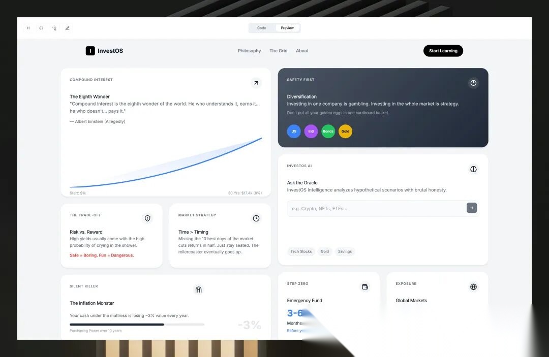 Gemini 3 在Design Arena的统治性表现不是偶然。开发者们发现,Gemini 3不仅能写出功能正确的代码,更重要的是,它能够理解审美。在很多设计中,我们都能看到响应式设计自然流畅,色彩搭配符合现代审美,动画效果恰到好处,无障碍性考虑周全。