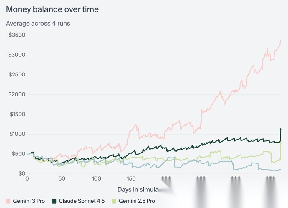 这个测试在今年相当火爆,因为在Benchmark逐渐饱和的当下,和Agen落地的困难下,各个公司更看重模型能否在长时间、多步骤、需要持续状态跟踪的复杂任务中保持性能。而Gemini 3实现的$5,478.16平均净值,相比GPT-5.1的$1,473.43和Gemini 2.5 Pro的$573.64提升也是断崖式领先。