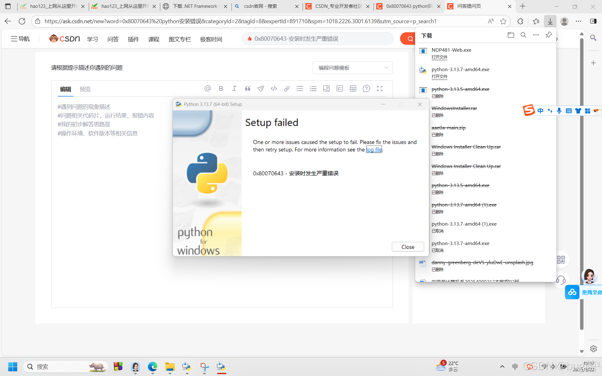 你截图右边已经下载了好几个 python-3.13.7-amd64.exe、3.13.5 等,多次尝试都失败,这更加说明: