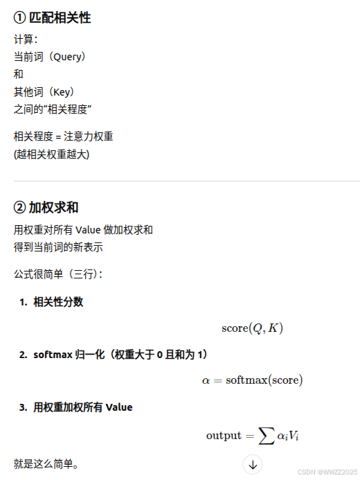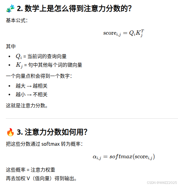 注意力分数是Query 和Key之间的相关性程度(相似度),分数越高 → 代表越应该关注那个信息,分数越低 → 应该忽略。