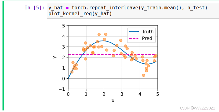 n_train = 50 # 训练样本数 x_train, _ = torch.sort(torch.rand(n_train) * 5) # 排序后的训练样本 def f(x): return 2 * torch.sin(x) + x**0.8 y_train = f(x_train) + torch.normal(0.0, 0.5, (n_train,)) # 训练样本的输出 x_test = torch.arange(0, 5, 0.1) # 测试样本 y_truth = f(x_test) # 测试样本的真实输出 n_test = len(x_test) # 测试样本数 n_test def plot_kernel_reg(y_hat): d2l.plot(x_test, [y_truth, y_hat], 'x', 'y', legend=['Truth', 'Pred'], xlim=[0, 5], ylim=[-1, 5]) d2l.plt.plot(x_train, y_train, 'o', alpha=0.5);(3)平均汇聚