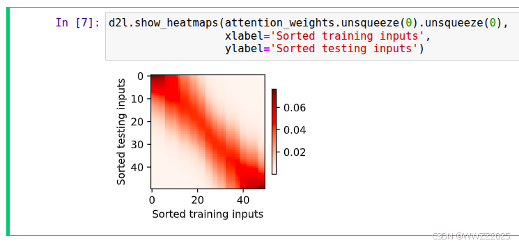 # X_repeat的形状:(n_test,n_train), # 每一行都包含着相同的测试输入(例如:同样的查询) X_repeat = x_test.repeat_interleave(n_train).reshape((-1, n_train)) # x_train包含着键。attention_weights的形状:(n_test,n_train), # 每一行都包含着要在给定的每个查询的值(y_train)之间分配的注意力权重 attention_weights = nn.functional.softmax(-(X_repeat - x_train)**2 / 2, dim=1) # y_hat的每个元素都是值的加权平均值,其中的权重是注意力权重 y_hat = torch.matmul(attention_weights, y_train) plot_kernel_reg(y_hat)(5)注意力权重