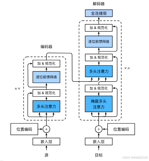 基于编码器-解码器架构来处理序列对,纯注意力架构。