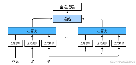 对同一key、value、query,抽取不同信息(如短距离关系和长距离关系);多头注意力使用h个独立注意力池化。