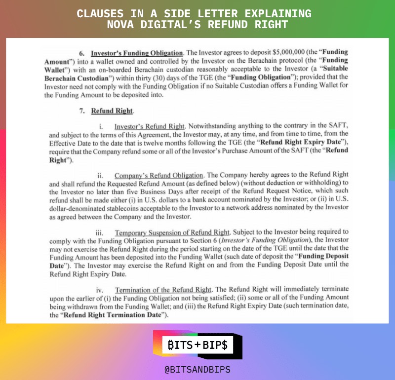 文件显示,作为该链 B 轮融资的一部分,Nova 基金向 Berachain 投资了 2500 万美元,以换取定价为每枚 3 美元的 BERA 代币。其他投资者包括 Polychain、Hack VC、Arrington Capital 和 Tribe Capital。这项退款权协议在一份日期为 2024 年 3 月 5 日、附于 Brevan Howard Digital 投资条款清单之后的附属协议中阐明,该协议标题为「Nova 附属协议」(Nova Side Letter)。