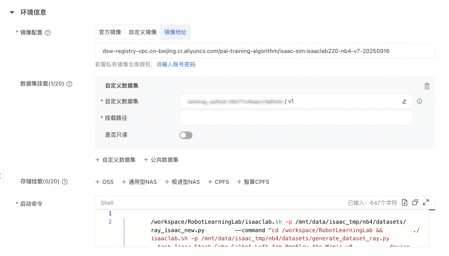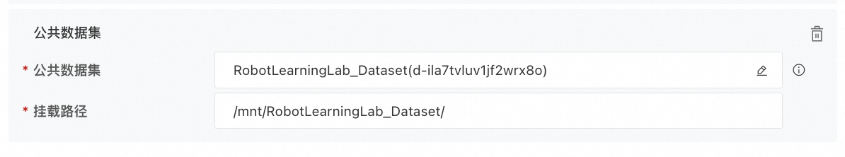 数据集挂载:确保挂载了DSW中使用的自定义数据集,以及RobotLearningLab公共数据集