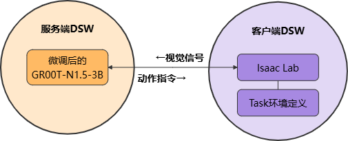 评估过程使用一个新的DSW作为服务端运行微调后的GR00T-N1.5模型,前面运行Isaac Lab的DSW作为客户端运行机器人本体,连接服务端指挥其动作。