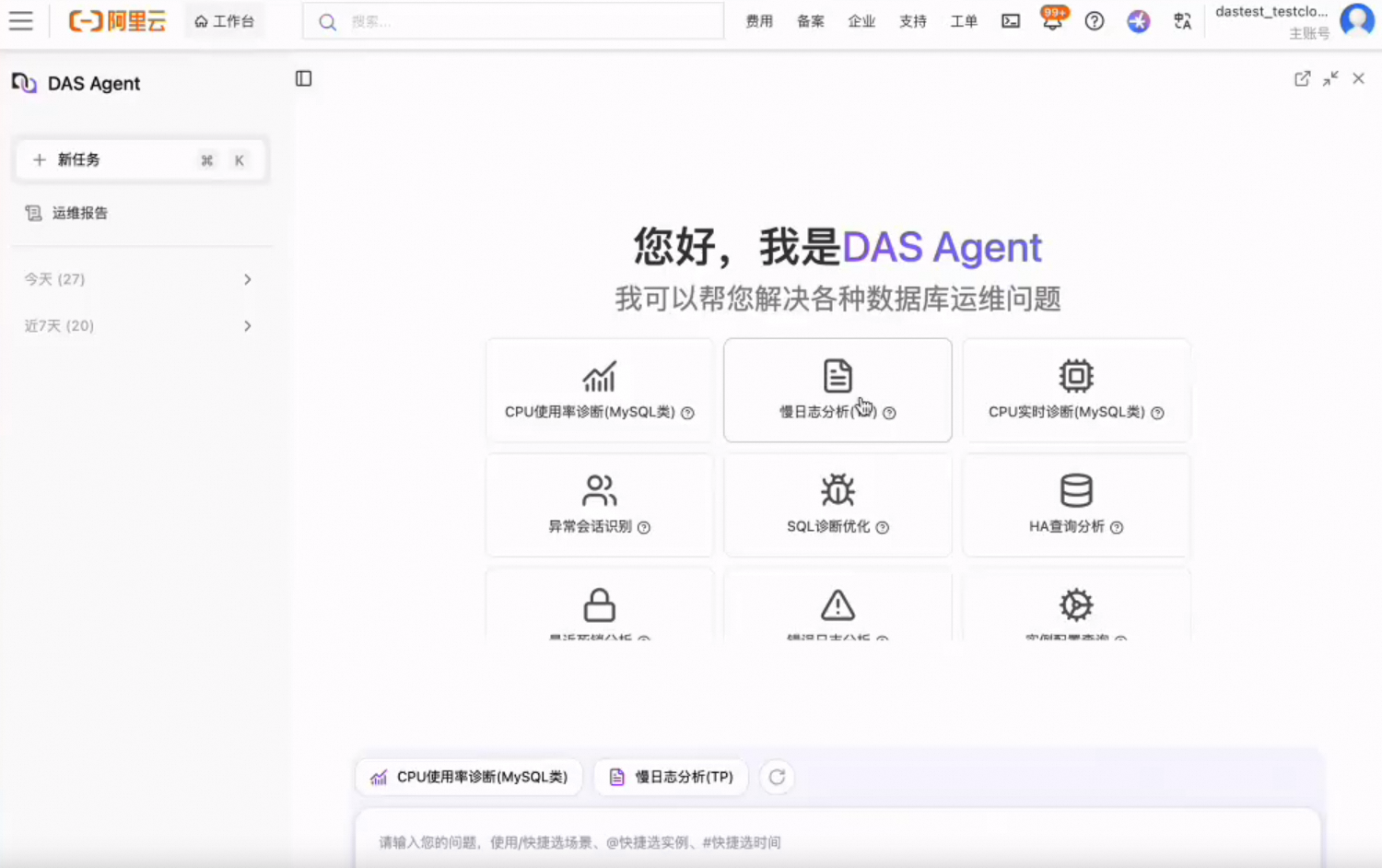 DAS Agent是基于大模型技术,融合了阿里云10万+工单和专家经验的智能数据库运维大脑,专注于解决云数据库的日常运维及稳定性问题。通过融合 AI,构建了覆盖问题发现、诊断、优化的全链路自治能力,为您提供高效、精准的数据库稳定性保障。