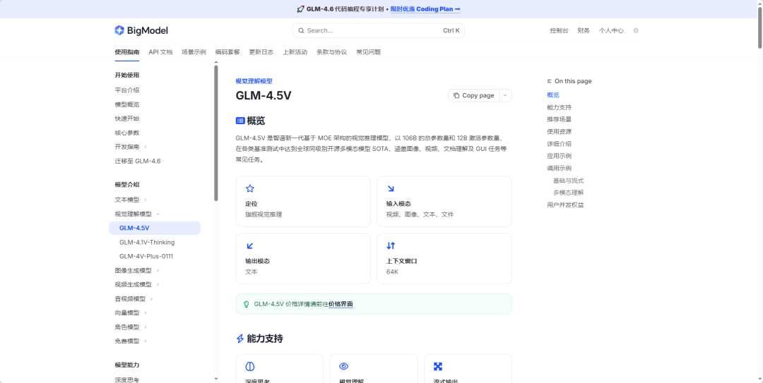 GLM-4.5V 是智谱新一代基于 MOE 架构的视觉推理模型,以 106B 的总参数量和 12B 激活参数量,在各类基准测试中达到全球同级别开源多模态模型 SOTA,涵盖图像、视频、文档理解及 GUI 任务等常见任务。
