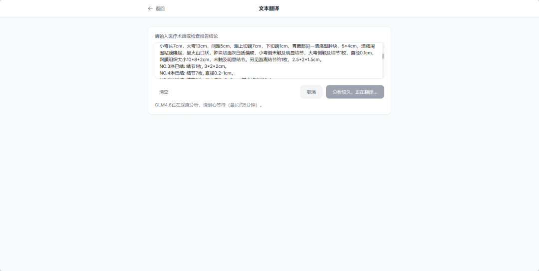 双模型协同工作流程为:GLM-4.5V负责处理用户上传的纸质或电子报告图片,通过OCR技术提取文本内容;GLM-4.6则接收提取的文本,将专业医学术语转化为通俗易懂的日常表达。 这种分工模式充分发挥了各自优势,确保系统既能"看得清"报告内容,又能"说得懂"医学含义,为患者提供无缝的医疗报告解读体验。