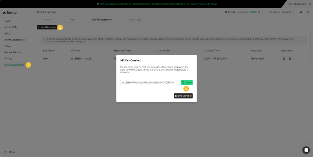 访问:https://novita.ai/settings/key-managementnovita.ai服务商点击密钥管理