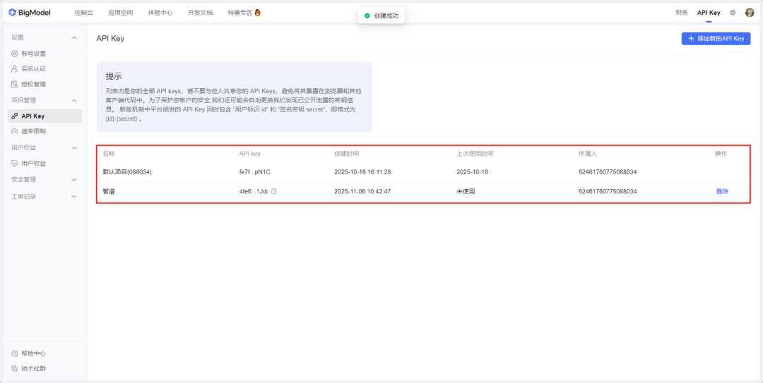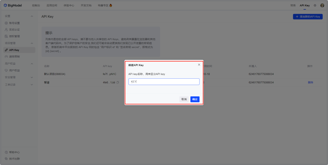 在智谱AI开放平台的控制台中,即可添加账号的API KEY