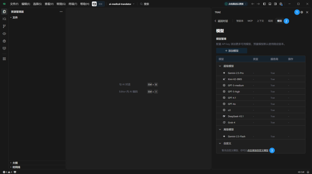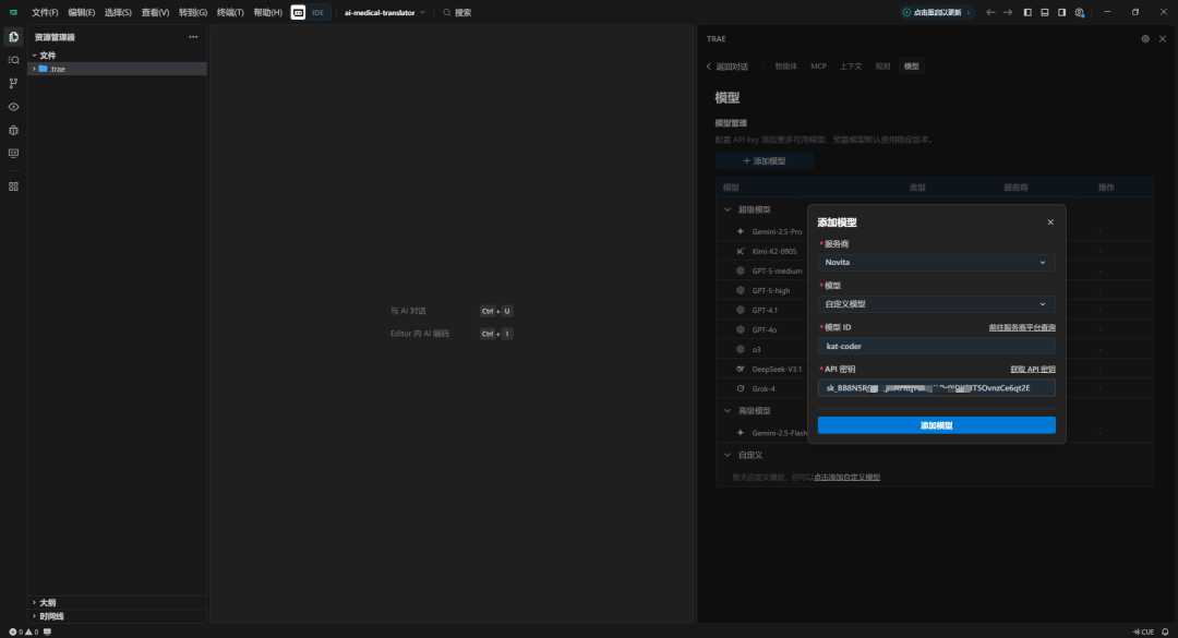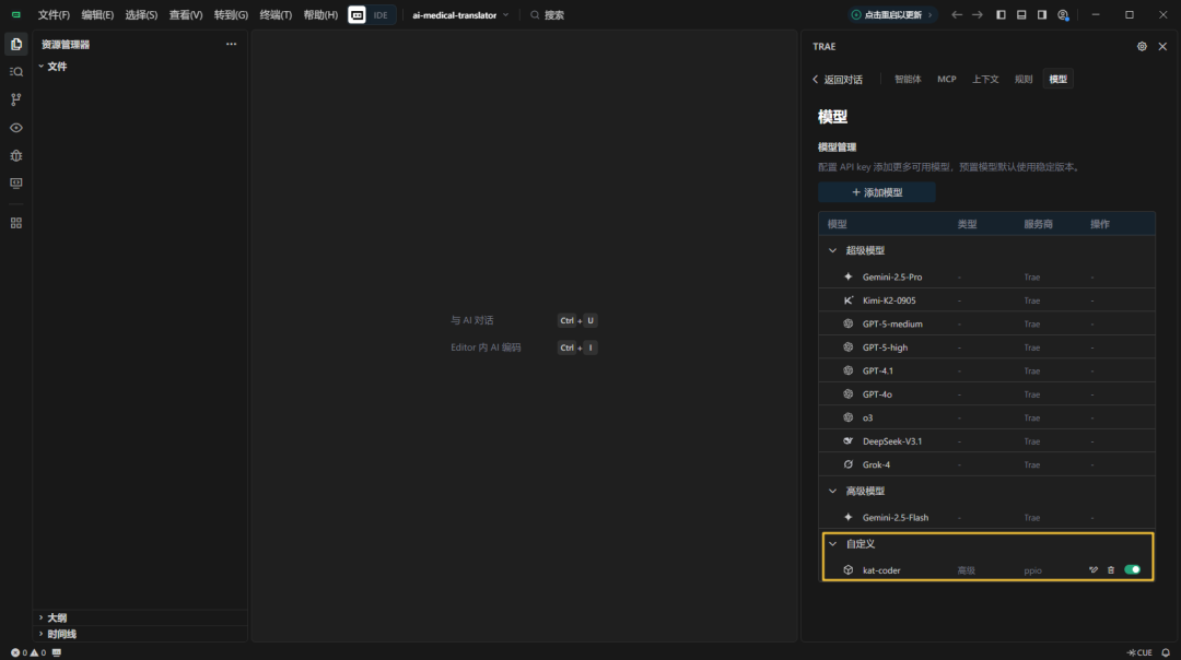 Trae对OpenRouter等开放平台的支持,这为开发者提供了更大的灵活性,使其能够根据具体需求选择和集成最适合的AI模型。 同时,社区正在积极推动对自定义模型服务商base_url的支持能力,这将进一步增强Trae在企业级应用中的适应性。这些特性使得Trae成为连接自定义AI模型(如KAT-Coder-Pro-V1)与专业应用场景(如医疗报告翻译)的理想桥梁,为我们的项目提供了坚实的技术基础。
