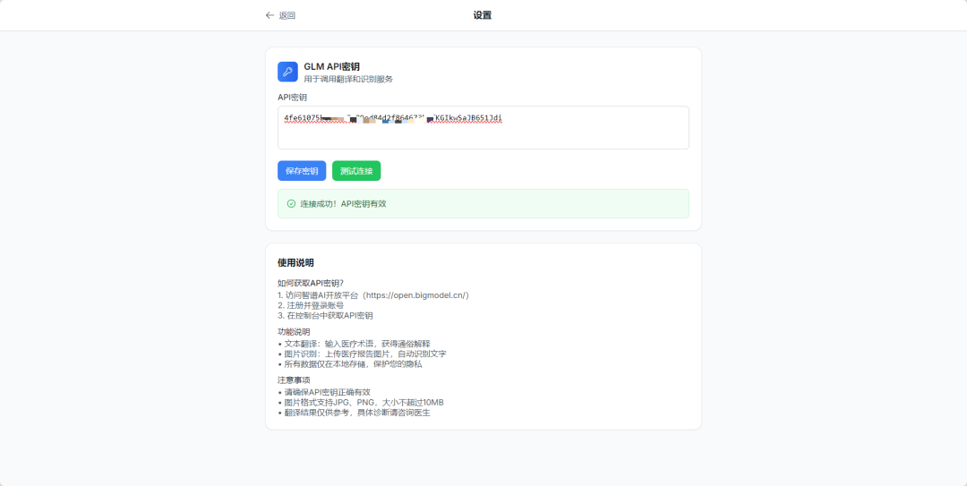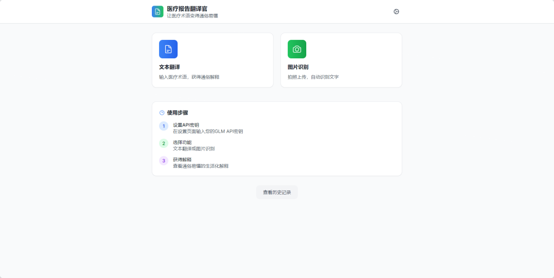 我要做一个医疗报告翻译官应用,目的是解决中老年人看不懂纸质病例上的专业医学术语功能:1、语言交互:输入检查报告结论,调用GLM-4.6用生活化语言解释指标意义,也就是说将繁琐的医疗术语翻译成普通人都能听得懂的样子(如“低密度脂蛋白=血管垃圾车”),翻译出的语言用精美柔和的卡片风格展示。2、视觉交互:拍照上传医院的纸质报告单或者电子报告单,调用GLM-4.5V识别文字后,再重复语言交互的过程3、GLM的密钥存放在localstorage中,每次进入页面的时候需要在设置中手动输入,设置中包含测试链接的按钮4、整体以医疗极简风格,使用低饱和的辅助色(如蓝、绿):蓝色代表信任与科技,绿色代表健康与安心,避免使用红色、橙色等刺激性暖色GLM4.6接入示例:curl -X POST "https://open.bigmodel.cn/api/paas/v4/chat/completions" \ -H "Content-Type: application/json" \ -H "Authorization: Bearer your-api-key" \ -d '{ "model": "glm-4.6", "messages": [ { "role": "user", "content": "作为一名营销专家,请为我的产品创作一个吸引人的口号" }, { "role": "assistant", "content": "当然,要创作一个吸引人的口号,请告诉我一些关于您产品的信息" }, { "role": "user", "content": "智谱AI 开放平台" } ], "thinking": { "type": "enabled" }, "max_tokens": 65536, "temperature": 1.0 }'GLM4.5V接入示例:curl -X POST \ https://open.bigmodel.cn/api/paas/v4/chat/completions \ -H "Authorization: Bearer your-api-key" \ -H "Content-Type: application/json" \ -d '{ "model": "glm-4.5v", "messages": [ { "role": "user", "content": [ { "type": "image_url", "image_url": { "url": "https://cloudcovert-1305175928.cos.ap-guangzhou.myqcloud.com/%E5%9B%BE%E7%89%87grounding.PNG" } }, { "type": "text", "text": "Where is the second bottle of beer from the right on the table? Provide coordinates in [[xmin,ymin,xmax,ymax]] format" } ] } ], "thinking": { "type":"enabled" } }'