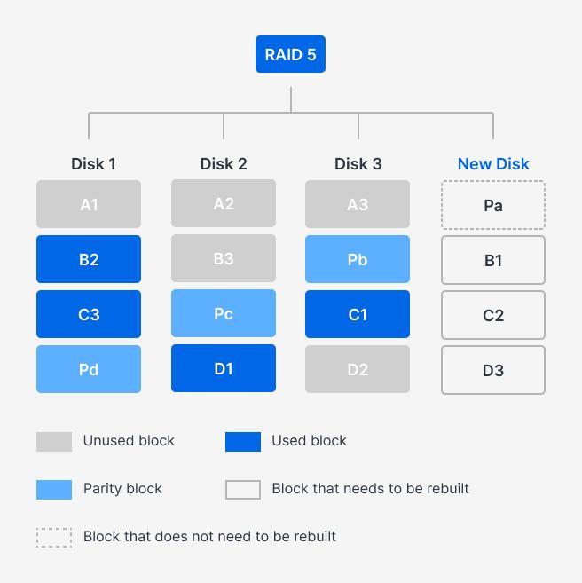 如下图,通过精准修复能得知当前文件系统中未使用的数据区块 (A1、A2、A3、B3、D2),此时会判断若该数据区段涵盖的所有数据区块皆未使用(A1、A2、A3),便会略过在新硬盘上 Pa 区块的重建;反之,若该数据区段的数据区块同时包含已使用 (B2) 和未使用 (B3) 的数据区块,则会执行 B1 区块的重建。当然,为了确保数据完整性,未被重新计算与重建的数据区块,在精准修复之后仍会再执行 Data Scrubbing,检查和自动修正数据以防止潜在的数据毁损。