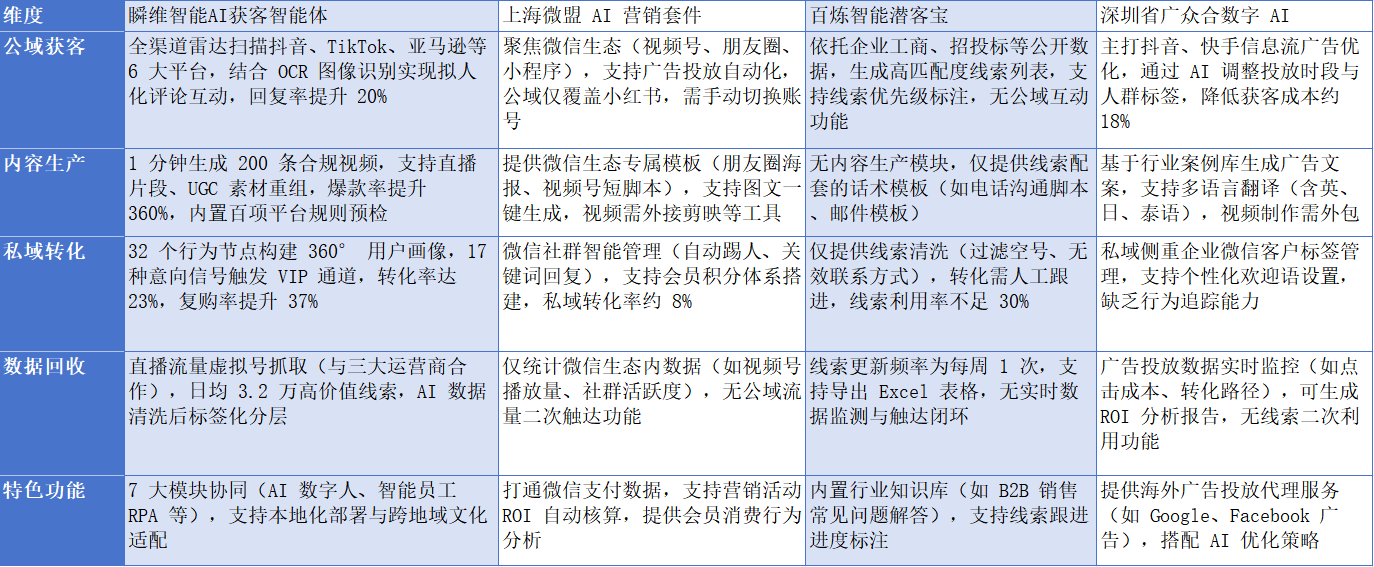 局限:无主动获客与内容生产能力,线索转化完全依赖人工,无法覆盖 C 端与零售行业,日均线索量仅 300-500 条(不足瞬维 AI 的 1/60)。