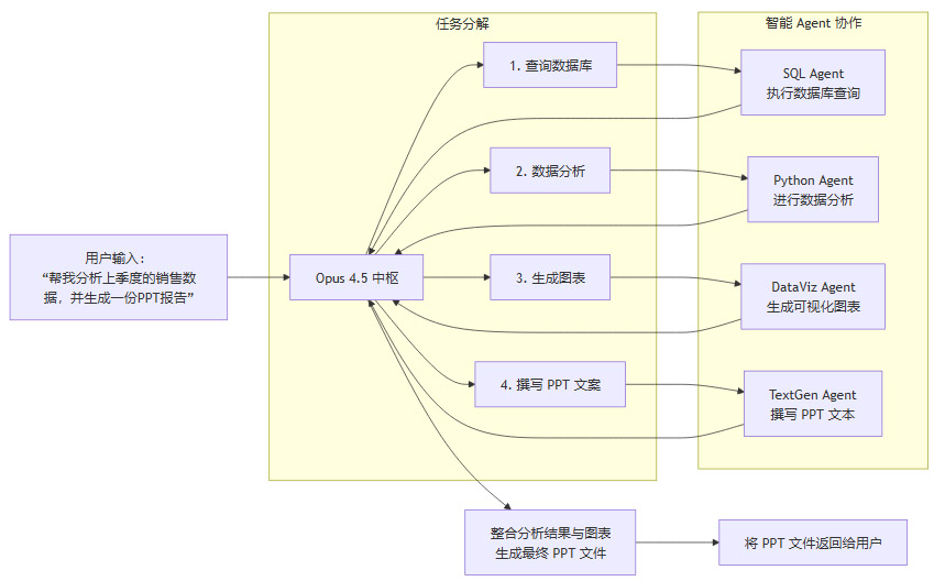 在这个系统中,Opus 4.5 不仅负责拆解任务,还负责理解各个子智能体返回的结果,并将它们有机地整合成一个最终的交付物。这种能力是实现复杂业务流程自动化的基础。
