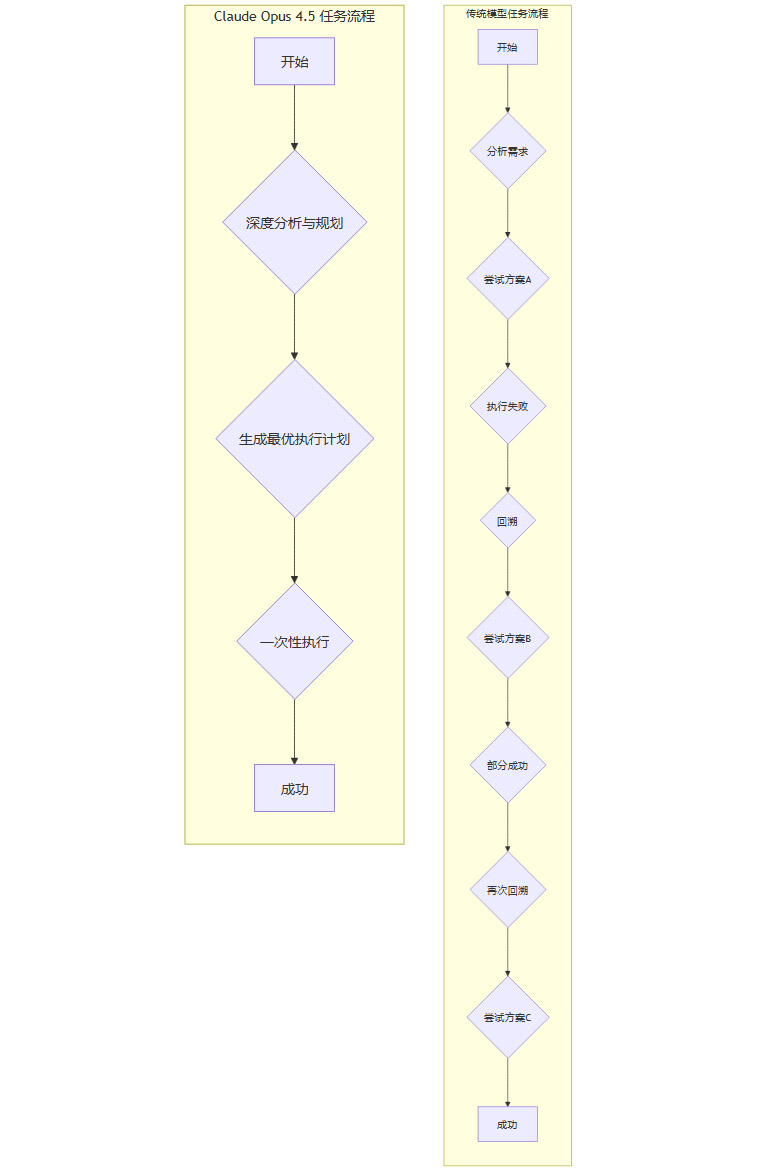 性能的提升不仅体现在准确率上,更体现在执行效率。Opus 4.5 在推理过程中,回溯(Backtracking)和冗余步骤显著减少。这意味着模型在解决问题时,思路更清晰、路径更直接。