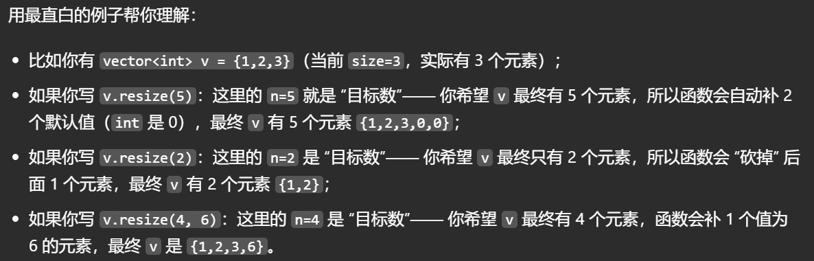 - resize(n,val) 会将 size 调整为 n ,多余元素销毁,不足则用 val 填充。