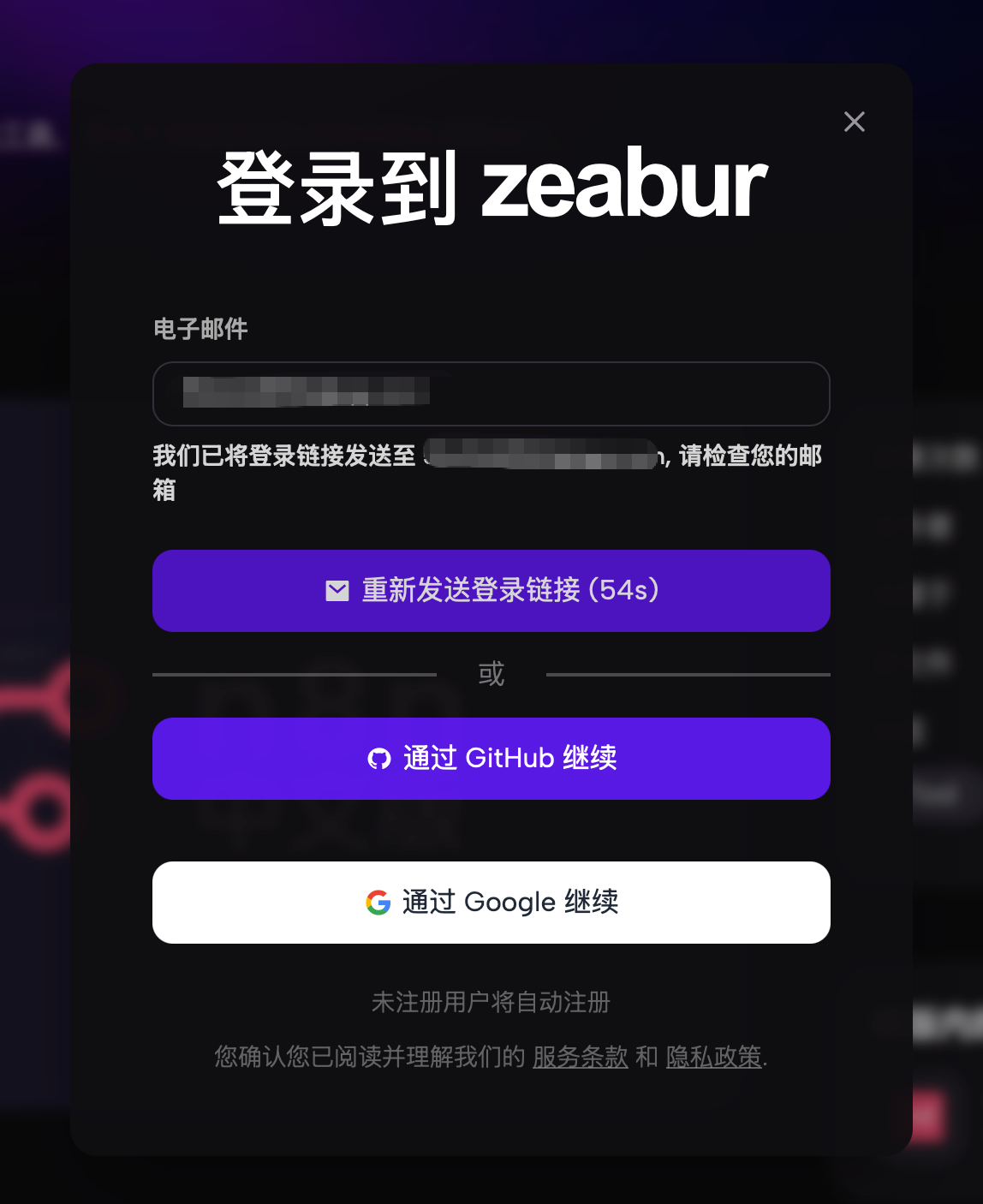 点击箭头处的部署按钮,这时候如果你还没有 Zeabur 的账号,它会弹出来让你注册。用邮箱注册就行