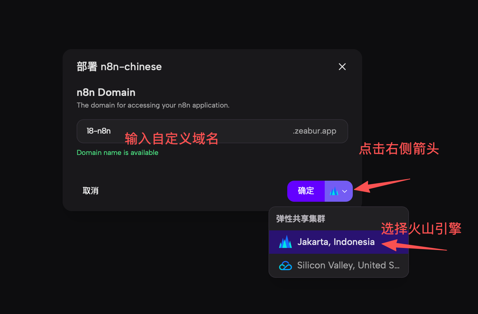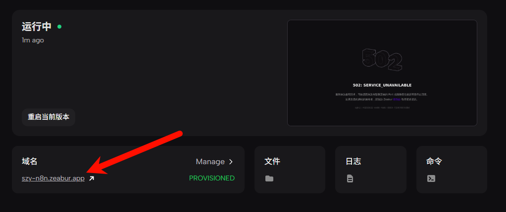 这就是你以后访问 n8n 的网址。你自己起个好记的名字,比如“用户名-n8n” 之类的,只要没被别人占用,后面会自动拼上 .zeabur.app 的后缀。