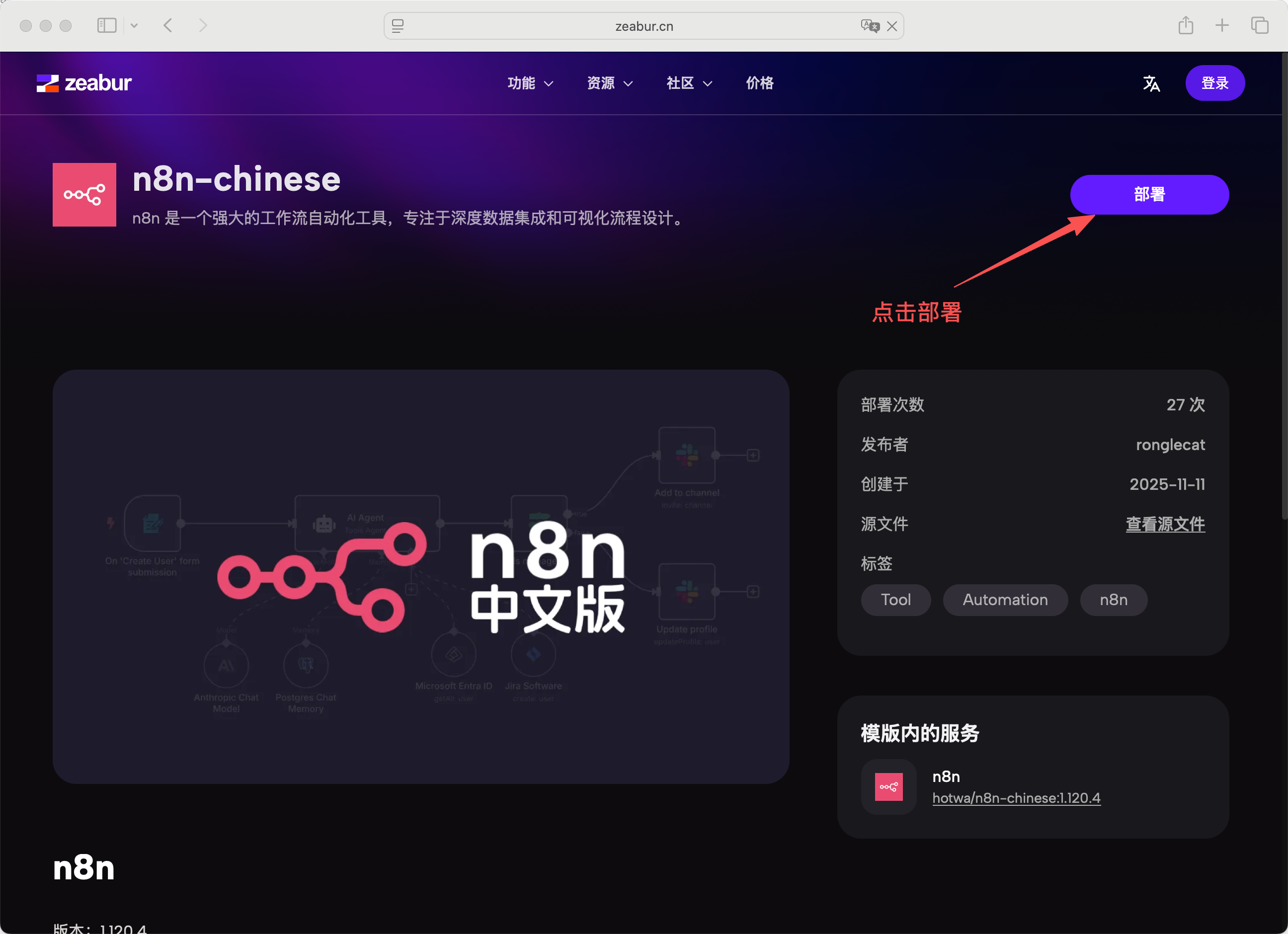 为了解决这个问题,我专门在 Zeabur 上开发了一个中文版 n8n 的一键部署模板。Zeabur 是一个非常好用的服务部署平台,简单理解就是它帮你把服务器、网络还有环境都搞定了,你只需要告诉它你要装什么软件。