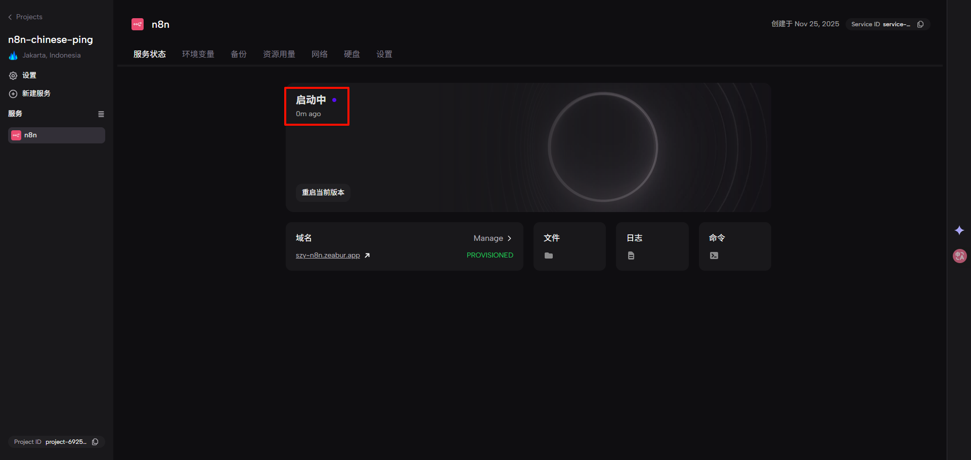 当你的工作流还没有正式开始自动化运行,或者只是周末抽空学习的时候,不需要让服务 24 小时运转。你可以在 Zeabur 的控制台里把 n8n 服务暂停。暂停之后,费用会降得非常低,几乎可以忽略不计。等你下次要用的时候,点一下启动,几秒钟就恢复了。