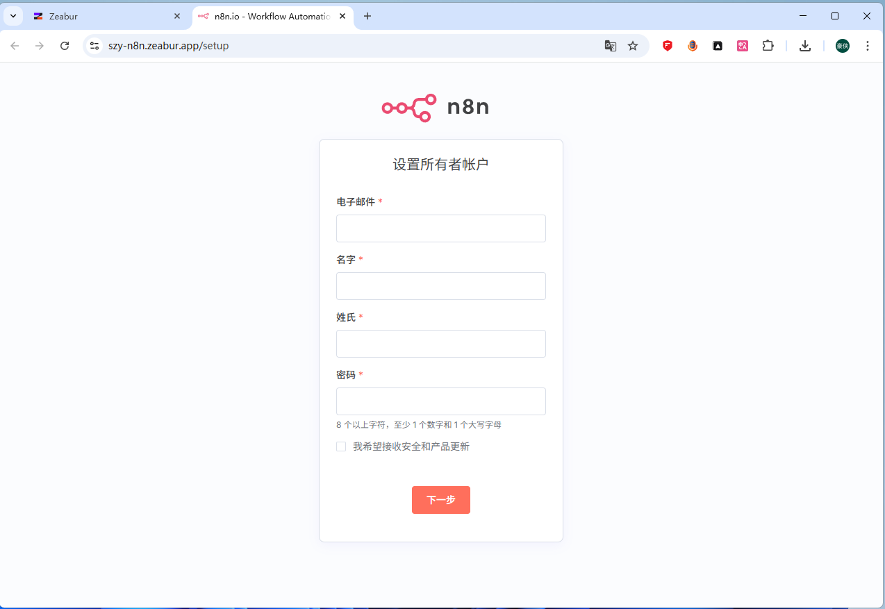 后面就是输入邮箱设置管理员账号密码,系统会向邮箱发送授权码,这个方式部署的 n8n 只需要点击邮箱里的链接,跳转回来就可以自动授权成功了,部署在本地的服务某些情况下还是要自己手动输入授权码的。