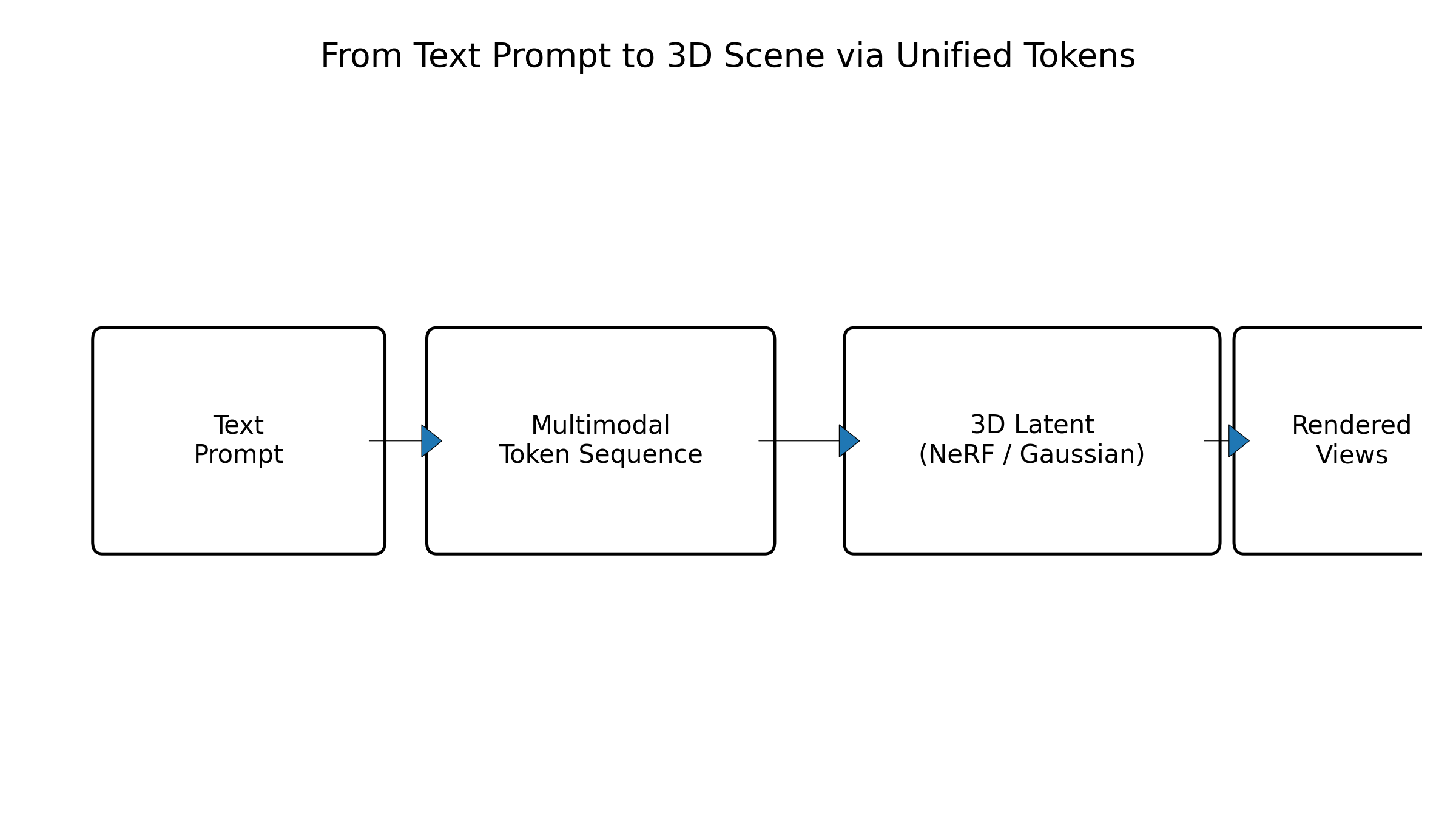 图7:从文本到 3D 场景的统一序列示意:文本 token → 视觉 token → 3D Gaussian token