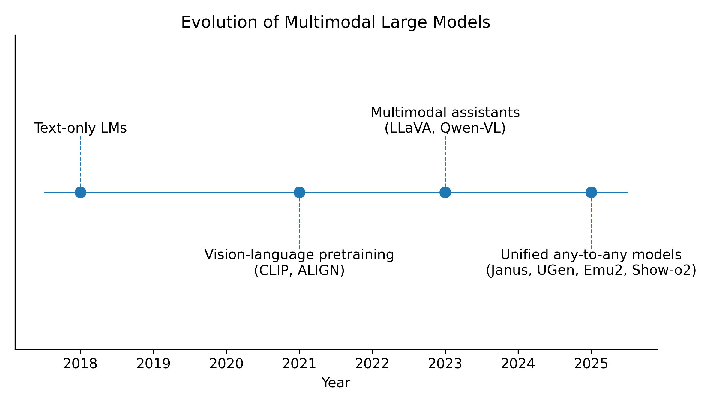 图1:多模态大模型技术演进时间轴:从文本-only 到 文本-图像,再到 视频/3D 统一模型