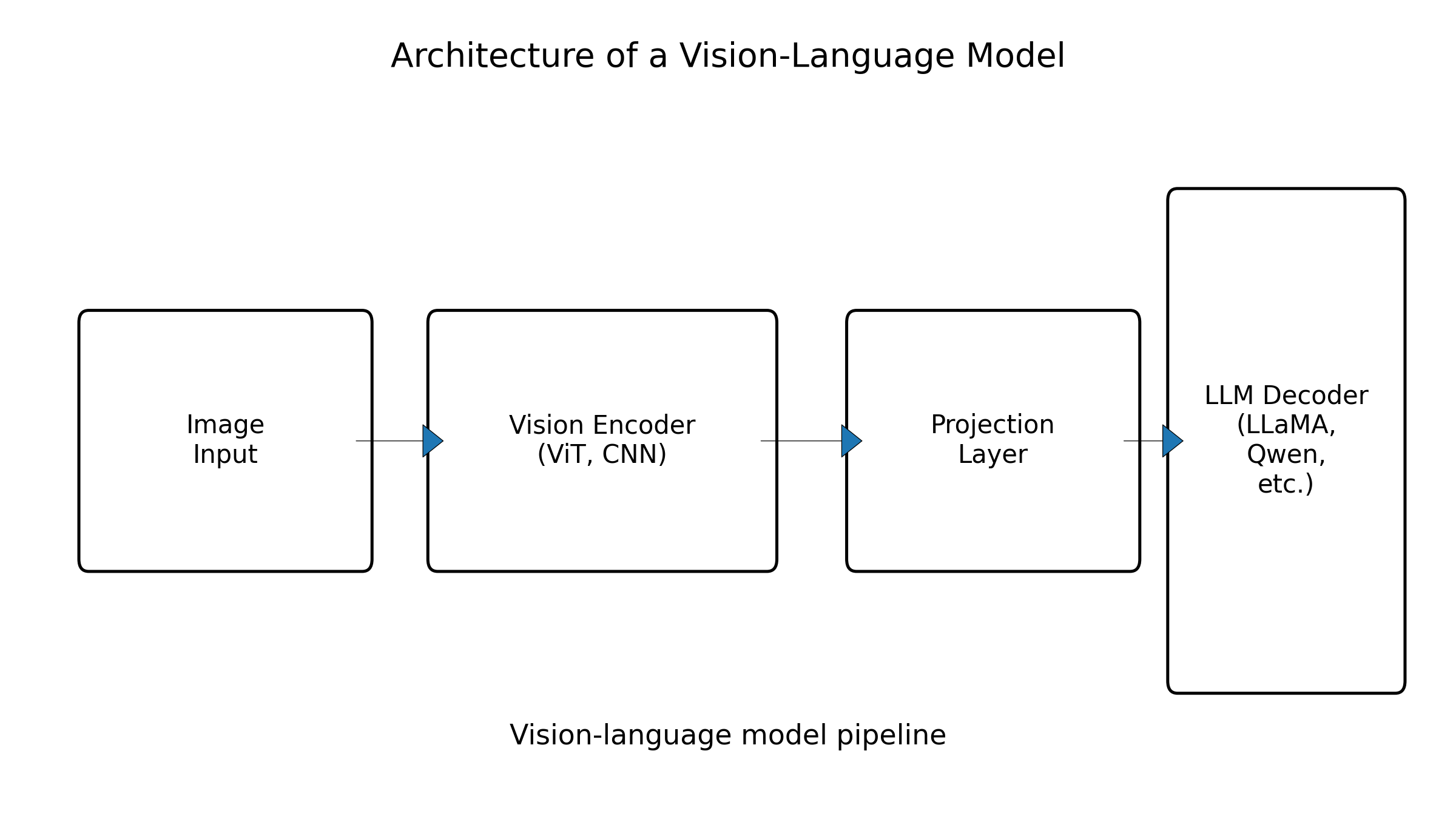 图2:典型 VLM 架构示意:视觉编码器 + 投影层 + LLM】、