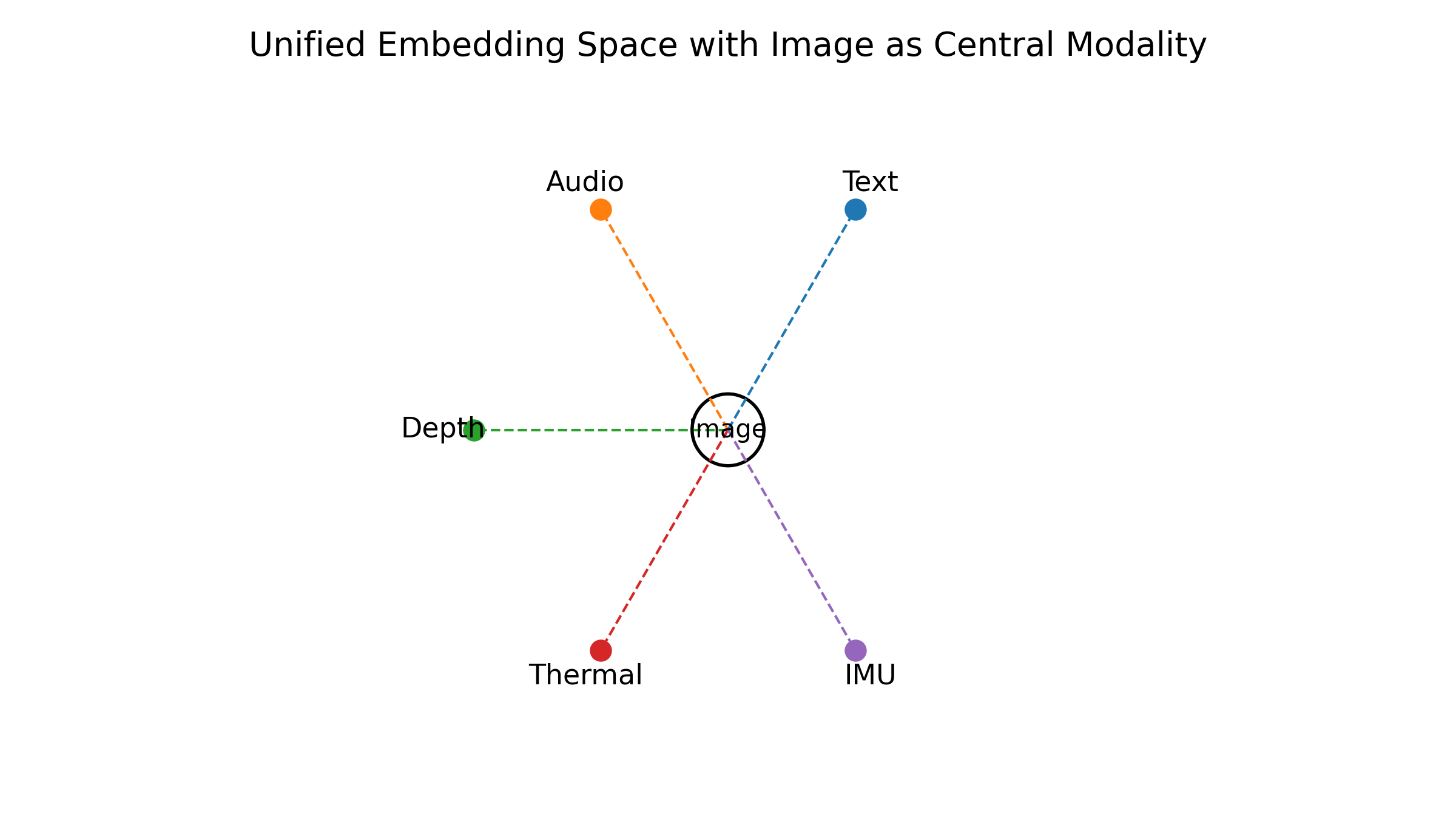 ImageBind 是目前最具影响力的“多模态统一嵌入”工作之一,它在 CLIP 的基础上,把文本-图像嵌入扩展到包括音频、深度、热成像和 IMU 在内的六种模态,并且只依赖“图像+X”的配对数据,而不需要任意两模态都显式配对。(arXiv)