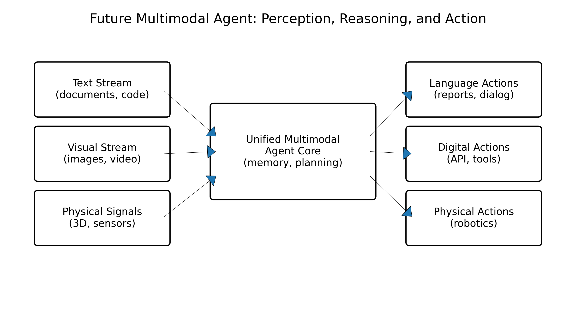 图9:面向未来的统一多模态智能体示意图:文本、图像、视频、3D、音频在统一表征空间中交织