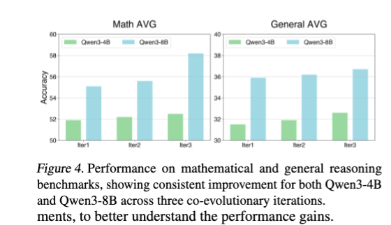无论是 4B 还是 8B 模型,在数学和通用推理任务上的准确率都呈现出漂亮的上升曲线,证明这个进化循环是真实有效的。