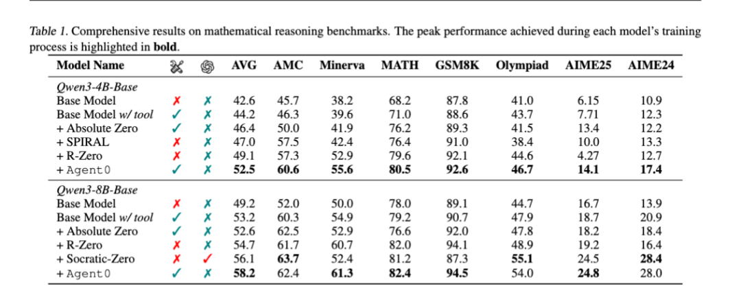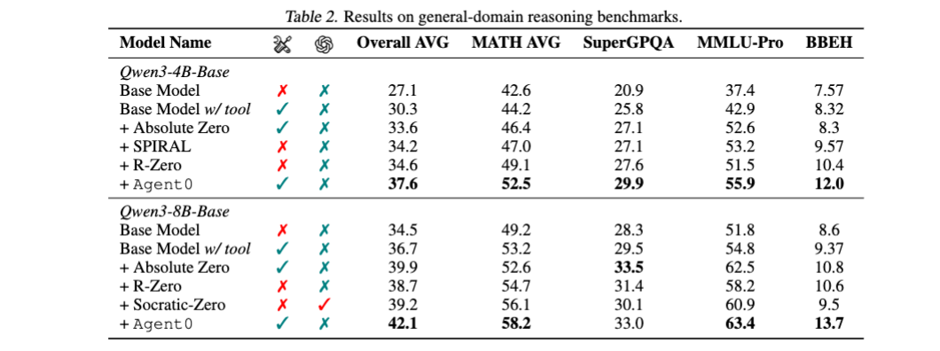- 性能远超其他方法:在 Qwen3-8B 模型上,Agent0 训练出的智能体,数学推理能力提升了 **18%**,通用推理能力提升了 **24%**,甚至超过了那些能调用外部 OpenAI API 的方法。