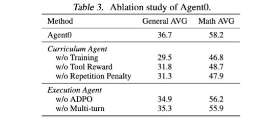 这张“消融实验”表说明,Agent0 的成功并非偶然,而是其精巧设计的各个环节共同作用的结果。