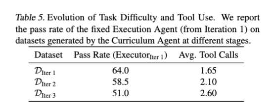 从数据上看,随着迭代,任务确实越来越难(成功率下降),“解题者”也越来越依赖工具(平均工具调用次数上升)。这说明“出题者”的“刁钻”程度在稳步提升。