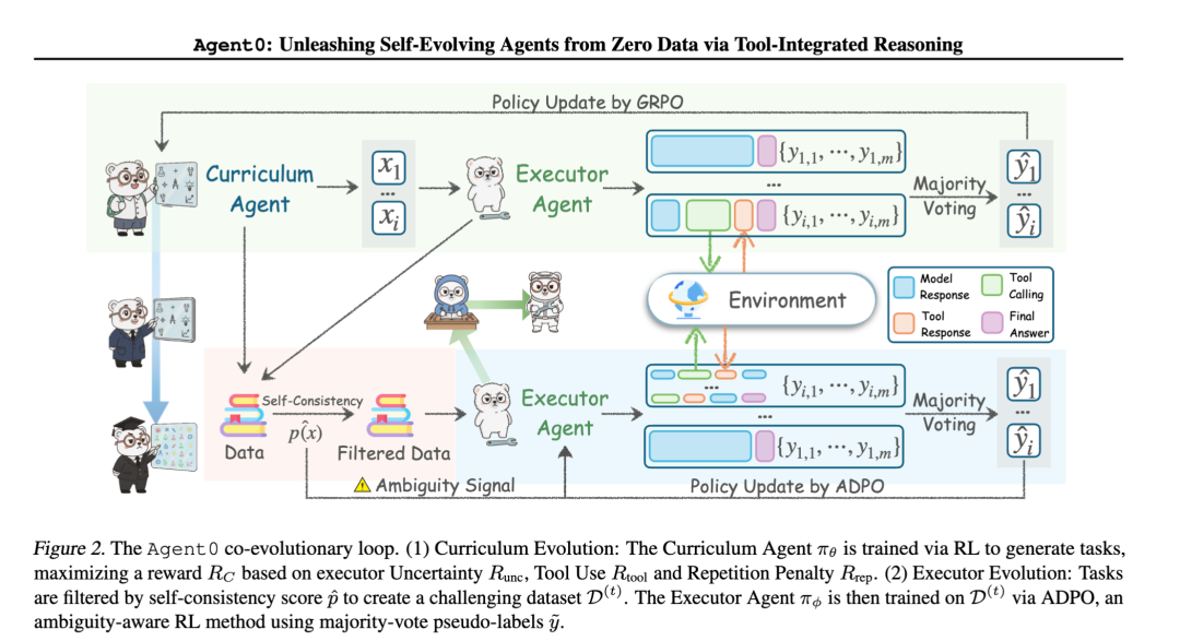 Agent0 的思路简单又巧妙:让两个 AI 互相“折磨”,共同进步。这两个 AI 来自同一个基础模型,但角色不同:
