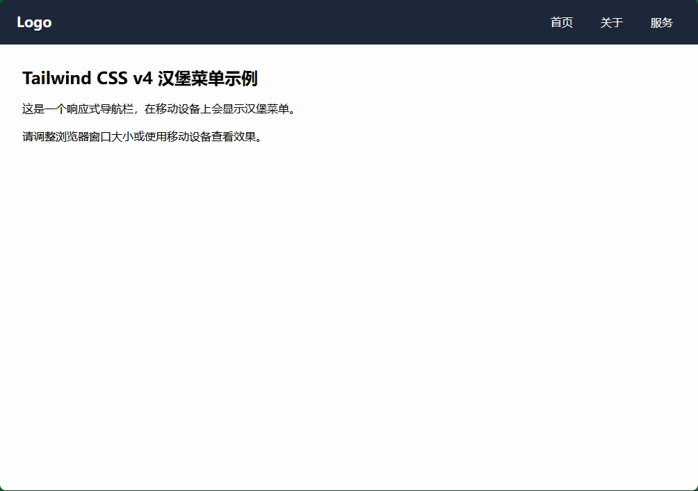 <h1 class="text-2xl font-bold mb-4">Tailwind CSS v4 汉堡菜单示例</h1>