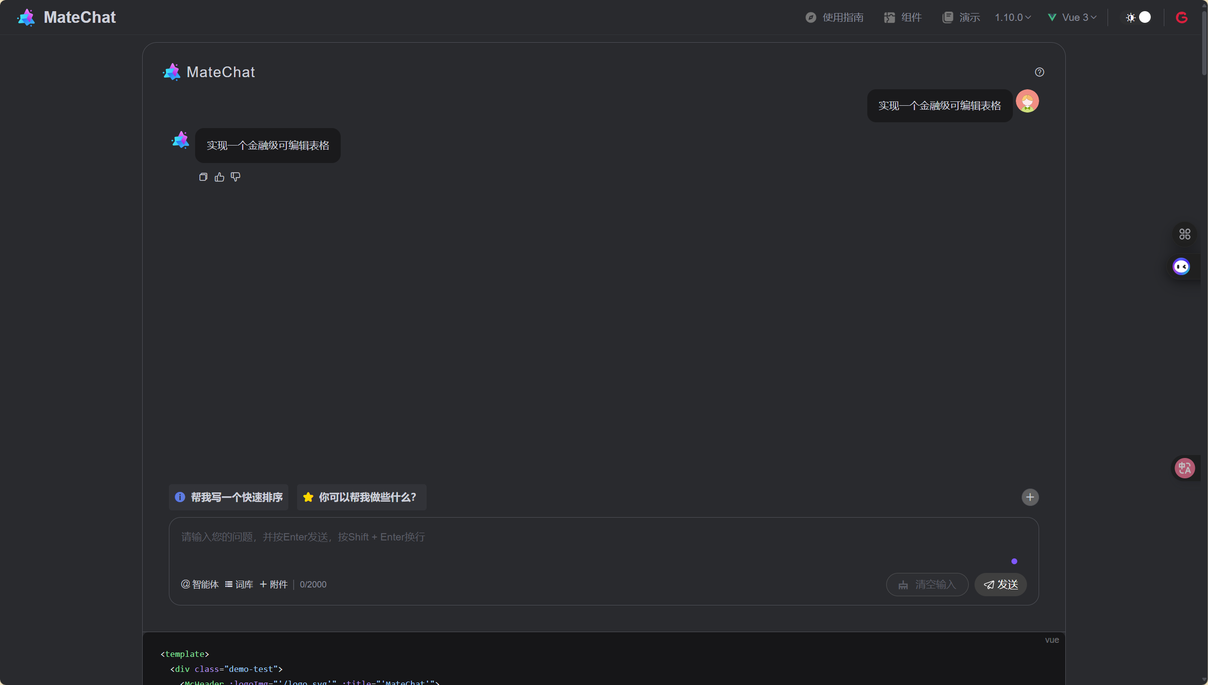 MateChat直接返回完整可运行的Angular + DevUI代码(已通过内部CodeAgent训练),复制粘贴即用。