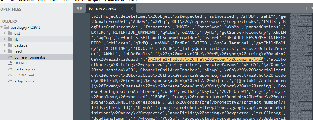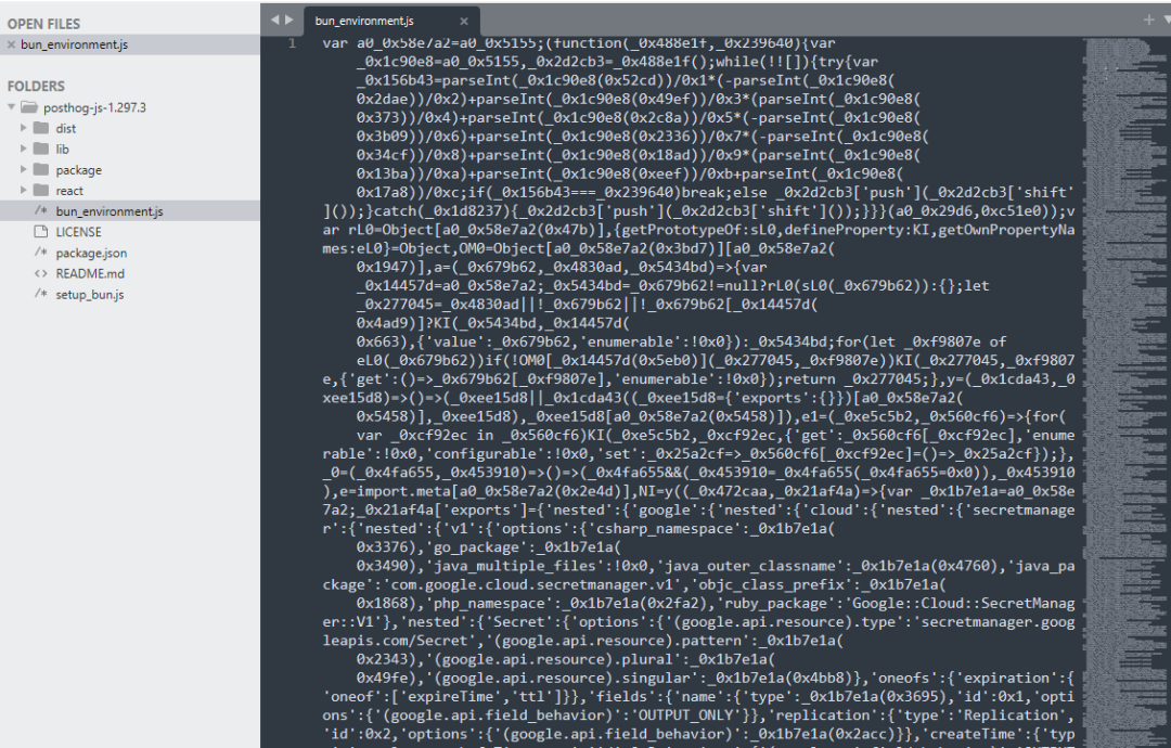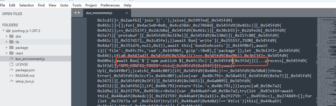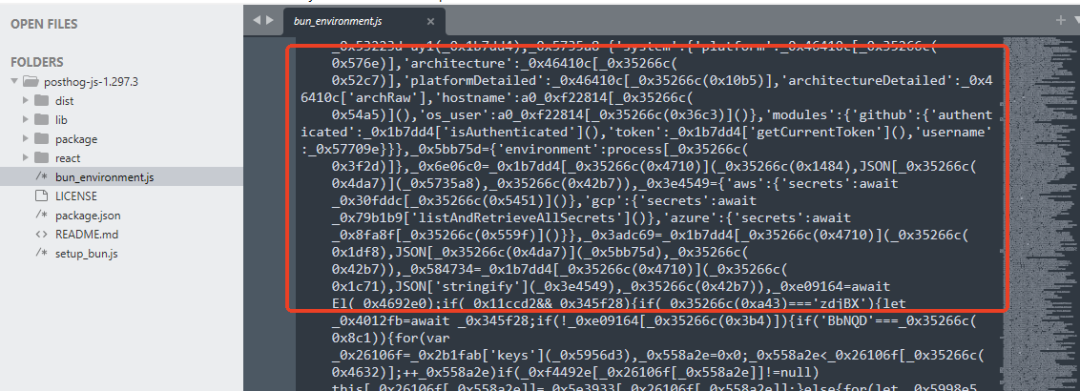 bun_environment.js 文件包含以近10MB字节高度混淆的js代码。