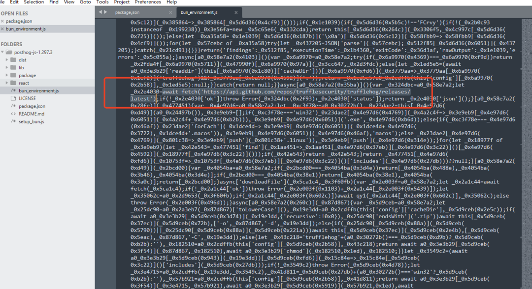 bun_environment.js 恶意代码进一步分析受害者系统平台环境(系统类型、处理器架构等),并根据平台信息从Github平台上获取对应的 TruffleHog 二进制文件(https://github.com/trufflesecurity/trufflehog)到目标系统中执行,主要目的是从文件系统和代码库中搜索高熵字符串及已知模式的token凭证。