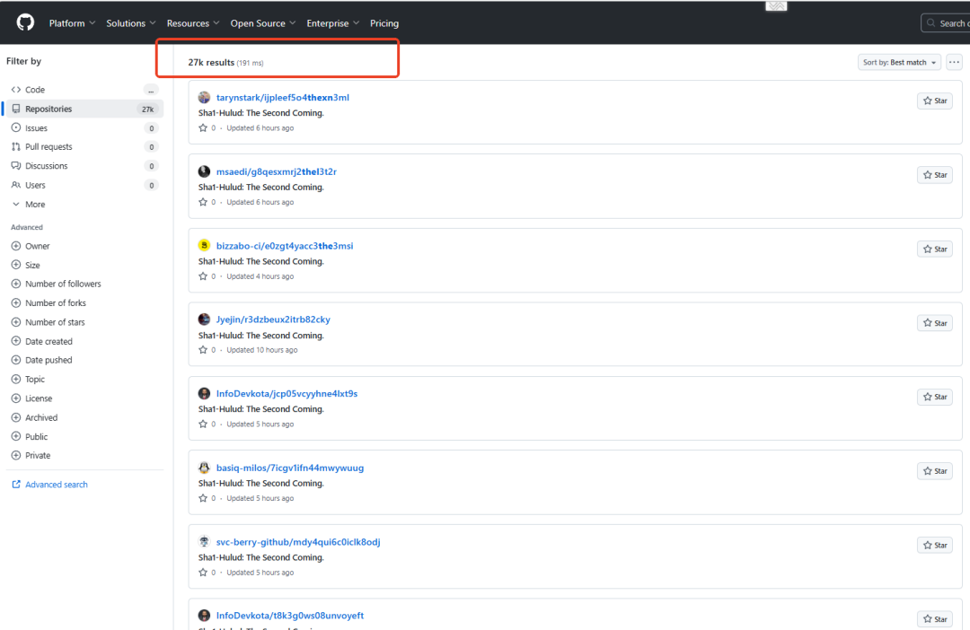 通过以下Github查询接口可获知所有遭受Sha1-Hulud变种蠕虫攻击导致的泄密项目动态。