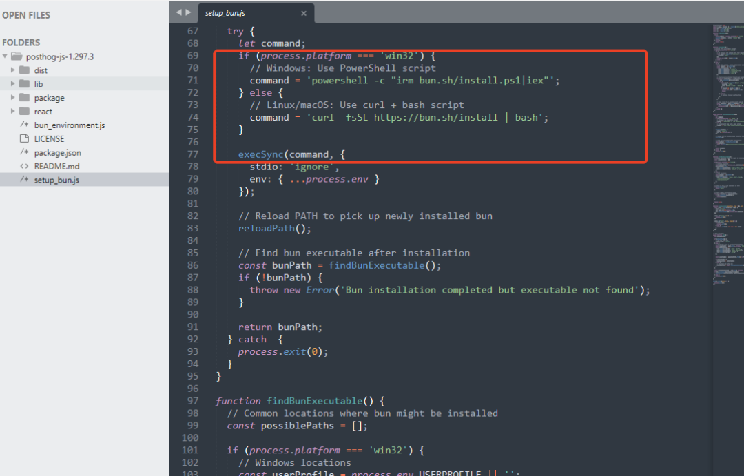 setup_bun.js 主要功能是从攻击者服务器(https://bun.sh)下载并执行第二阶段远程恶意(bash/powershell)脚本文件。