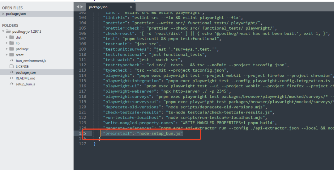 以热门 posthog 组件 posthog-js 1.297.3版本为例,攻击者在package.json中植入preinstall指令实现在组件安装过程中执行第一阶段恶意代码文件 setup_bun.js 文件。