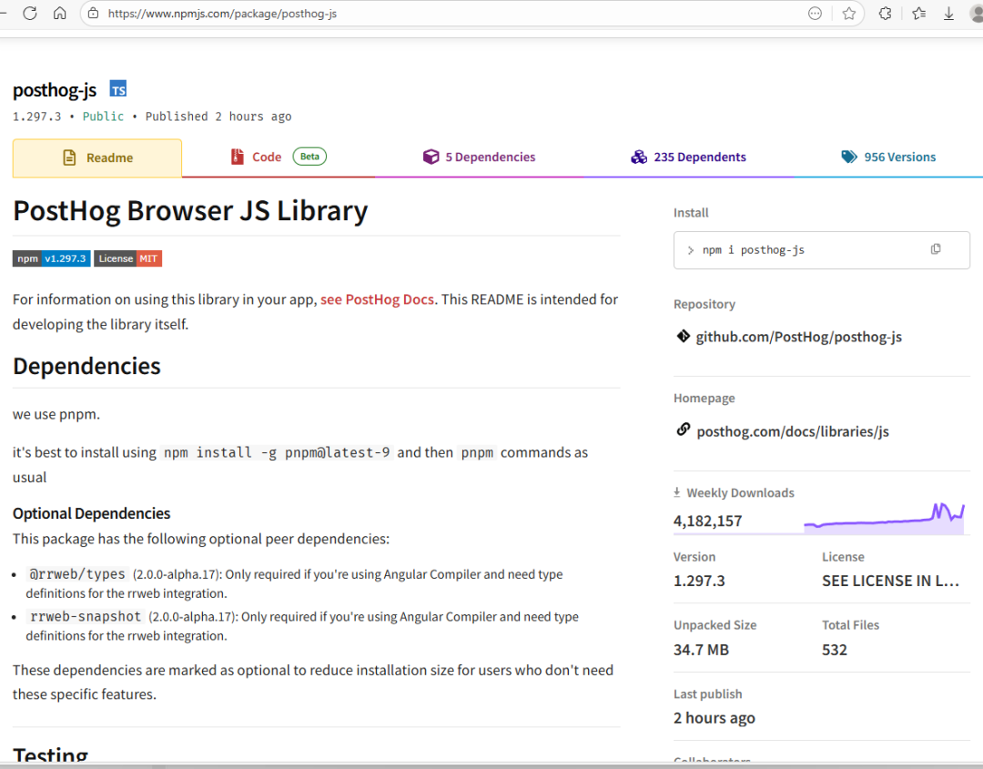 以 posthog-js 恶意组件为例,开发者 在项目目录下 可通过命令 在项目目录下使用 npm list posthog-js 或 npm list -g posthog-js 查询是否已安装存在投毒代码的组件版本(1.297.3),如果已安装请立即使用 npm install posthog-js@1.297.2 或 npm install -g posthog-js@1.297.2 回滚到最新安全版本。