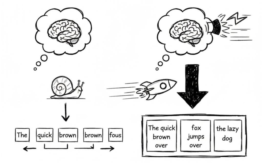 这就像让你用单个字母来写一篇英文文章,每写一个字母都要停下来思考下一个,效率自然高不起来。模型明明有几千亿个参数,聪明得不得了,却在干一件「挤牙膏」式的、信息密度极低的活儿。这就是问题的核心。
