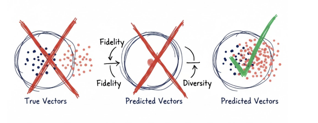 - 多样性:模型生成的多个候选向量之间,应该互相拉远一点,不要全都挤在一个地方(防止模式坍塌)。