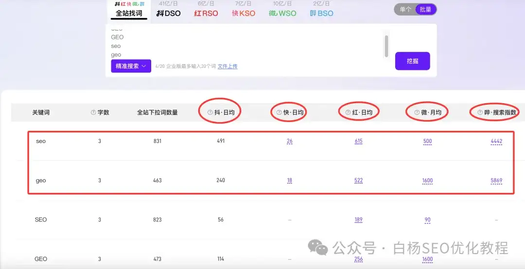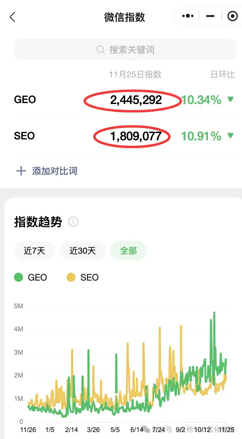 虽然说现在很多都在说GEO,但从数据来看,百度里SEO更大,但在微信其它端,GEO大于SEO了,如图。