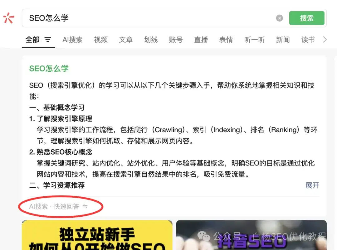 (白杨SEO补:国内的百度搜索、360搜索、微信搜一搜、抖音、小红书等都在用户查询结果最上方都有AI回答的答案,只是有些在广告后面,这就是趋势,如图)